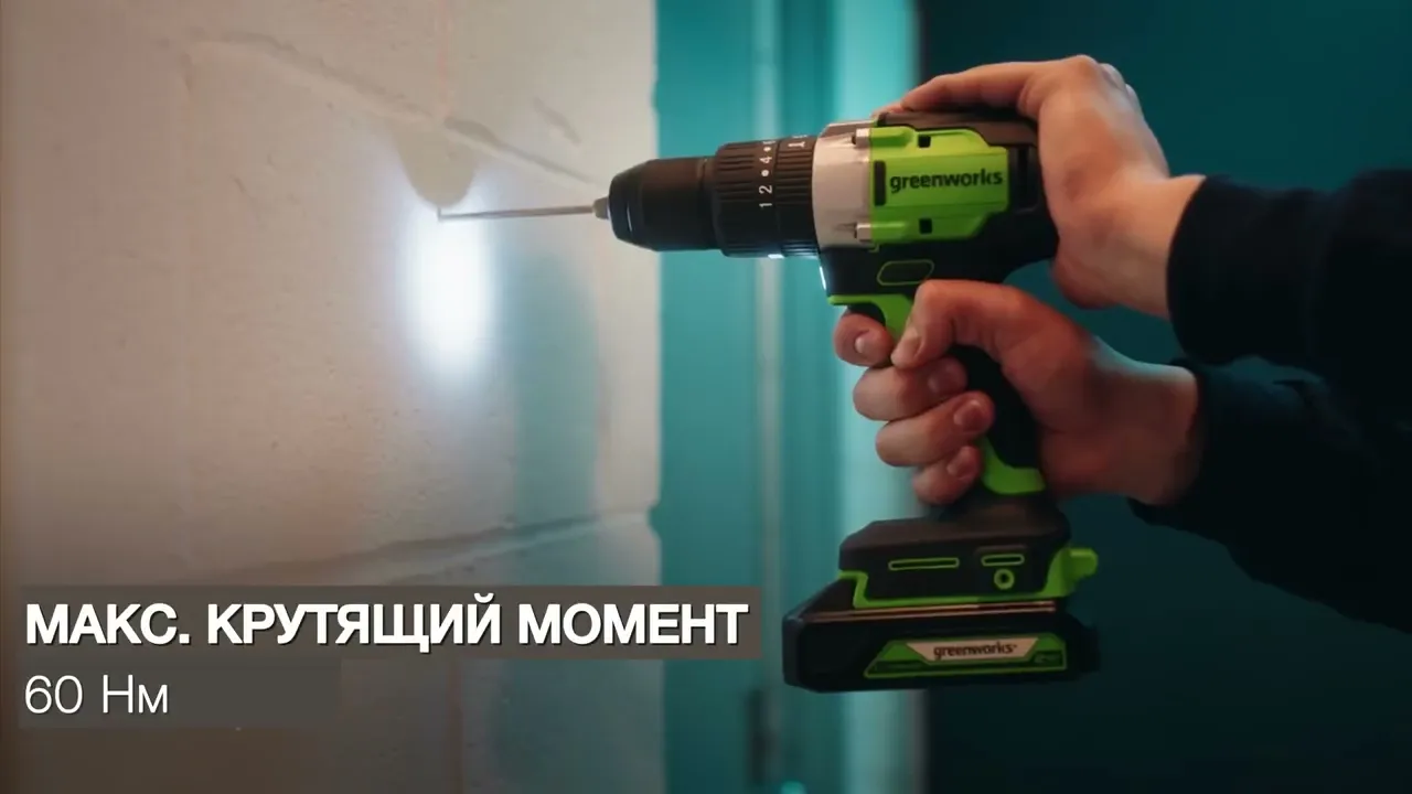 Дрель-шуруповерт ударная аккумуляторная Greenworks 24В GD24DD60K2 (арт. 3704107UA) сочетает в себе три функции: сверление с ударом, сверление без удара и работа с шурупами. Предназначена для бытового применения, но может справиться и с более тяжелыми задачами. Благодаря мощному бесщеточному двигателю, она обеспечивает максимальный крутящий момент до 60 Нм, а двухскоростной режим (0-450 об/мин и 0-1700 об/мин) позволяет точно подстраивать работу под задачу.